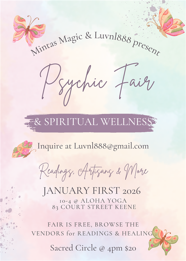 Jan 1 I will be offering healing and readings at a Psychic & Wellness Fair at Aloha Yoga in Keene from 10am-4pm.